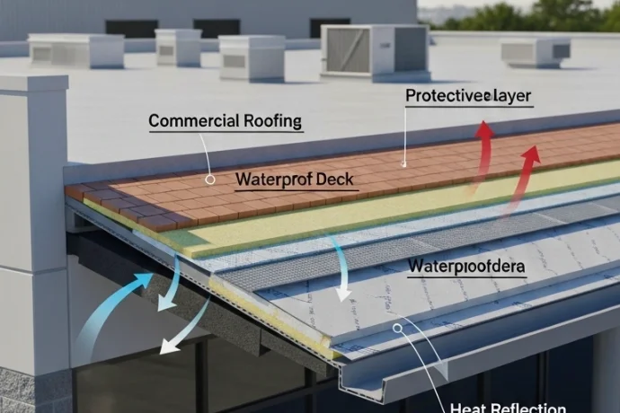 Commercial roofing means building, fixing, or replacing roofs on business buildings. At CommercialRoofingInHouston, our licensed roofing experts make strong, safe, and long-lasting roofs. We handle roof repair, replacement, and installation, and design roofs to protect your building from Houston storms, heat, and water damage